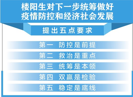 楼阳生对下一步统筹做好疫情防控和经济社会发展,提出五点要求。第一,防控是前提。做好防控工作,始终是打赢抗击疫情这场战役的重要前提。要严防死守“双返”“双防”警戒线,农村、社区和全部法人单位对各项防控措施要落实、落实、再落实,绝不能因为新增确诊病例数在低位运行,就盲目乐观、松懈松劲,绝不能因麻痹大意、工作疏漏导致新的传染源、引发新的疫情爆点。第二,救治是重点。各市要继续加大确诊病例科学救治力度,严防轻症变重症。太原市第四人民医院作为救治重症和危重症患者的主阵地,要聚全省优质医疗资源,尽锐作战,科学施治,坚决守住“双零”目标。核酸检测要全覆盖,再用两天时间把现有存量检测做完清底。要进一步落实隔离措施,对仍在居家隔离观察的继续严格执行相关居家隔离标准要求,同时及时排查新增确诊病例、疑似病例的密切接触者和密切接触者的密切接触者,对尚未有明确接触史的确诊病例要深入进行流行病学调查,防范扩散风险。要加大依法防控的宣传力度,引导返晋返工返学等人员如实报告春节后返晋前的旅居史、接触史和病史。隐瞒不报、造成严重后果的,要依法追究。要加强科研攻关,加强和充实省重大传染性疾病防控与诊治重点实验室力量,力争有所建树。第三,统筹是本领。要把落实精准方略贯穿统筹抓好疫情防控和改革发展安全稳定民生各项工作全过程。要精准防控,有序加快复工。绝不能因防控措施不到位造成复工后疫情扩散,也不能因噎废食怕疫情扩散耽误开复工,造成经济社会发展延误滞后。开发区要抓紧提升项目、企业开复工率,发挥转型综改主阵地、主引擎作用。要精准办理,有序加快开工。落实企业项目投资承诺制,点对点精准办理相关手续,做到成熟一个开工一个,成熟一批开工一批。要精准服务,有序加快达产。省市县各级联动,积极帮助企业解决用工、运输、资金等实际困难和问题,有效释放产能。要精准招商,有序加快项目签约。通过网上谈判、线上签约等多种形式,推动谈好的项目抓紧签约落地。要精准施策,有序加快社会生活正常运转。各地要以分区分级精准防控为抓手,坚持分类指导,在抓好疫情防控前提下,保“六稳”,保三大攻坚战,保改革发展安全稳定民生各项工作。第四,双赢是检验。要鲜明树立结果导向,把结果导向作为工作理念、工作方法、工作制度、工作标准,真正使认真负责、求真务实、真抓实干、狠抓落实成为广大党员干部的行动自觉,坚决打赢疫情防控和经济社会发展两场战役,以优异成绩接受党中央和全省人民的检验。第五,稳定是底线。疫情发生以来,各级党委、政府特别是公安机关忠诚履职,及时处理涉疫情违法行为,有力维护了全省社会大局稳定。下一步,要加强涉疫情矛盾纠纷和不稳定因素排查化解,各市县党政主要负责同志要亲自过问、亲自部署、亲自协调,坚决防止不稳定因素演变成影响社会稳定、干扰疫情防控的事件。要加强安全生产工作。开工复工和安全生产要同步抓,煤矿、非煤矿山、尾矿库、危化品等的安全生产要紧抓不放,坚决防范各类事故特别是重特大安全生产事故发生。要加强正面宣传。深入报道奋战在抗击疫情一线广大医护工作者、干部群众的先进事迹,进一步凝聚起众志成城抗击疫情的强大正能量。